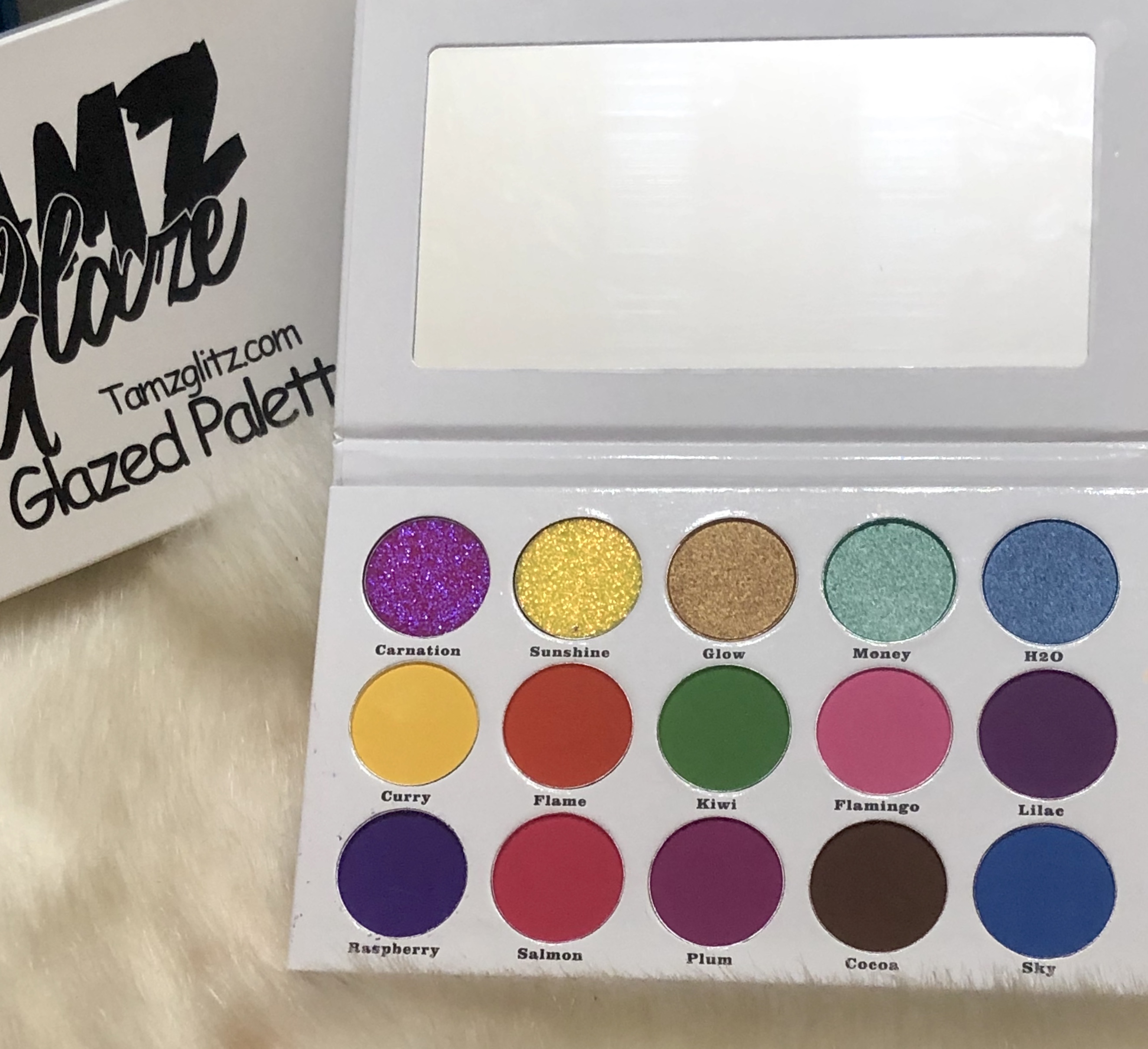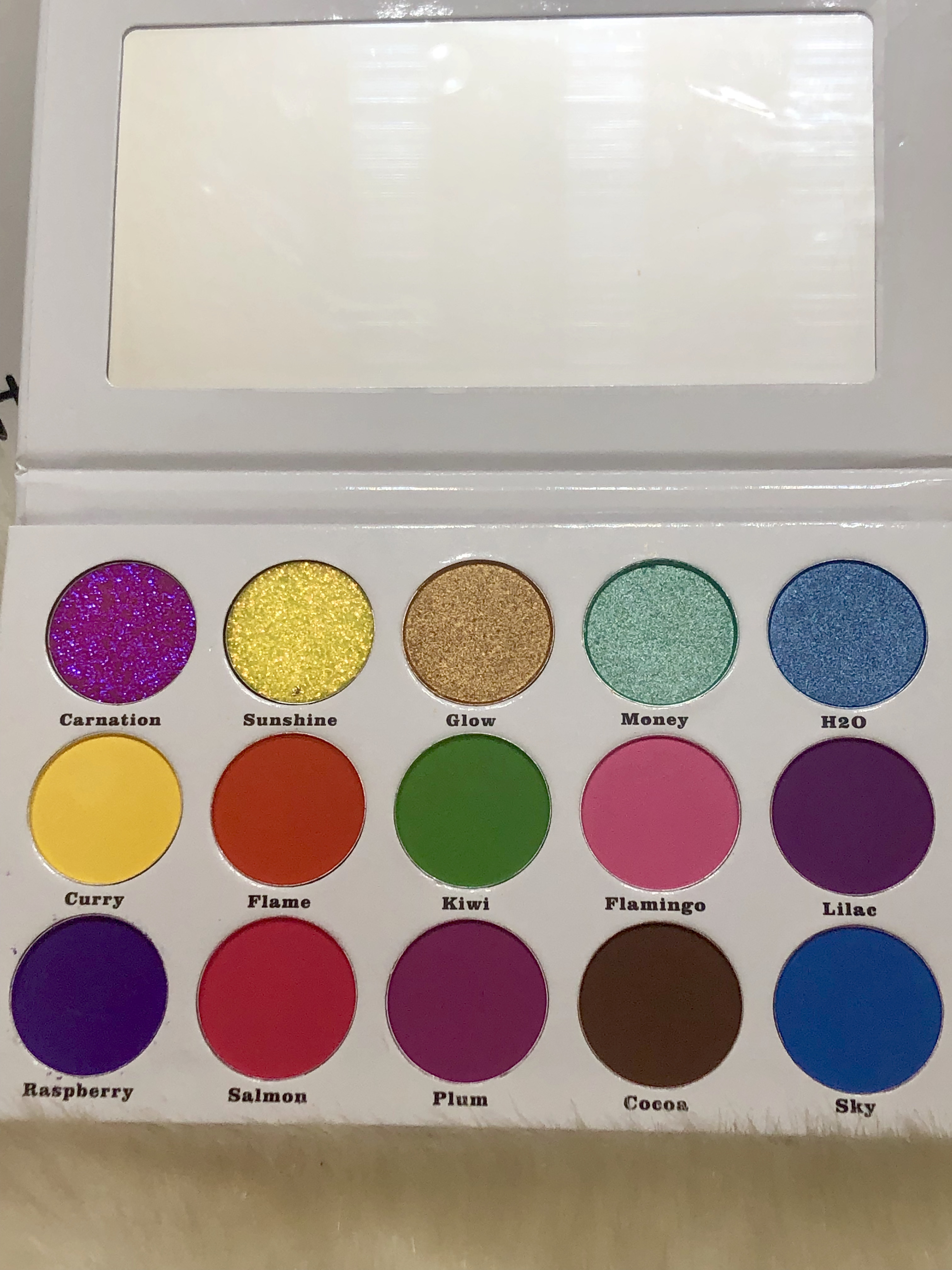 15 vibrant pigmented eyeshadow colors. Which consists of mattes,shimmers and pressed glitter. The perfect palette for spring and summer. Cruelty free